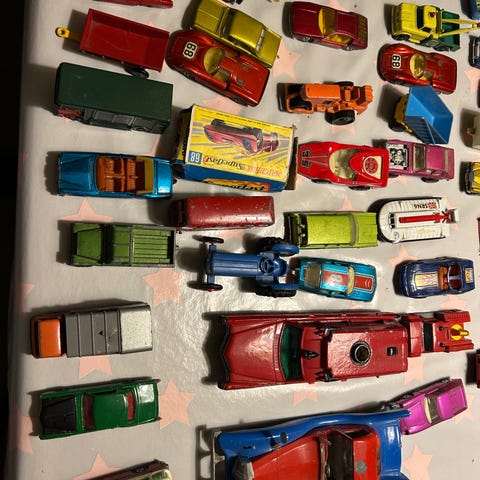 Samling af 12 små legetøjsbiler i god brugt stand. Blandet udvalg af racerbiler, sportsvogne og fantasibiler. Passer til leg, baner og samling.