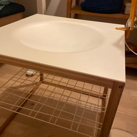 HOLMERUD sidebord har en speciel arkitektonisk form og praktisk opbevaringsplads. Det er designet til at stå op ad en sofas armlæn, men er lige så flot op ad en væg.