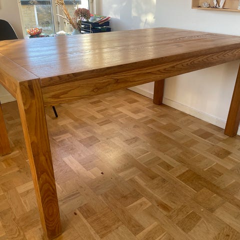 Spisebord i massivt egetræ oprindeligt fra Ilva, men har en del år på bagen og er brugt, men i fin stand. Trænger til en kærlig hånd og/eller en slibning.