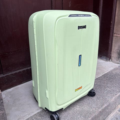 Der er normale brugsspor udvendigt i form af mindre ridser og mærker (ses på billederne). Lynlåse, hjul og håndtag fungerer som de skal. Indersiden er pæn og uden skader.