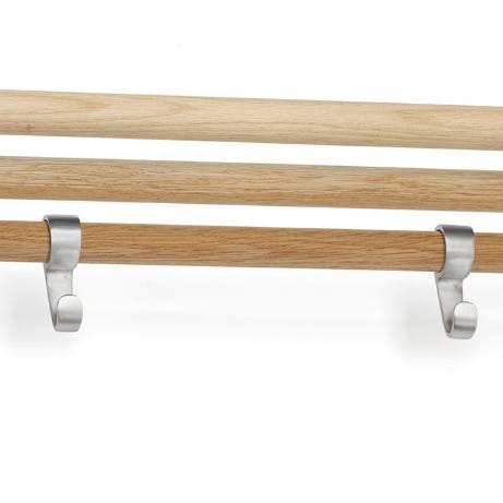 Hvid hattehylde i træ med bøjlestang og knager.