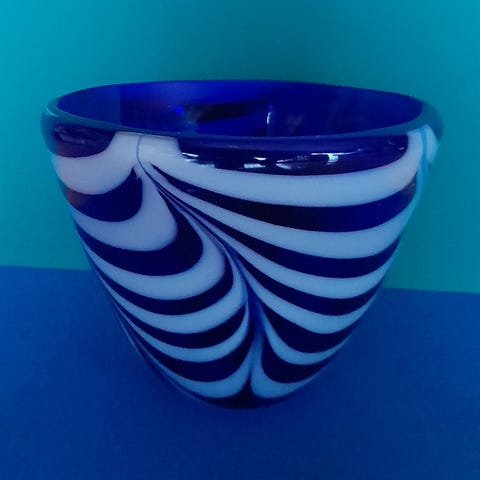 Smuk og dekorativ glasskål i koboltblå med spiral mønster.