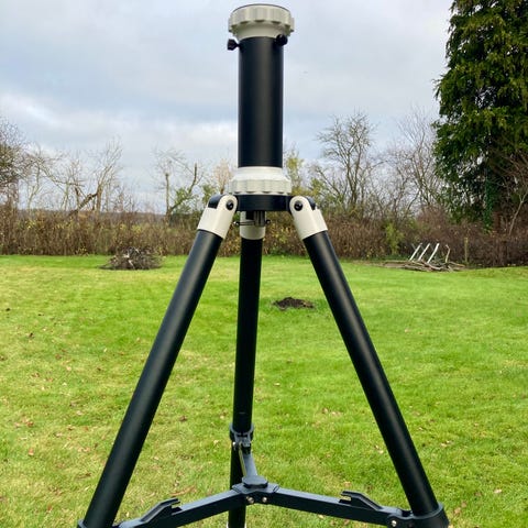 Garmin GPS-enhed med tripod. Enheden har en sort skærm og er designet til præcis navigation. Tripodbenene giver stabilitet ved brug på flade overflader.
