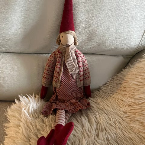 Smuk Maileg nissepige fra 2013. Hun måler 100 cm og har blå øjne. Hun er iført en smuk kjole med den fineste klokke