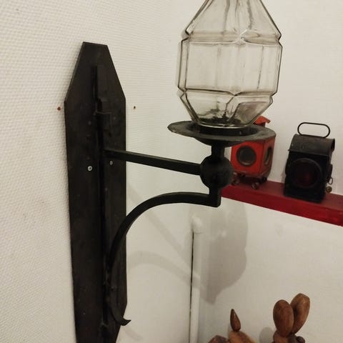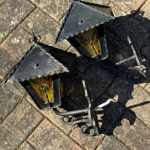 Smuk og velholdt smedejerns lampe med ravfarvet lygteglas. Mål højde 55 cm bredde 25 cm dybde 9 cm.
