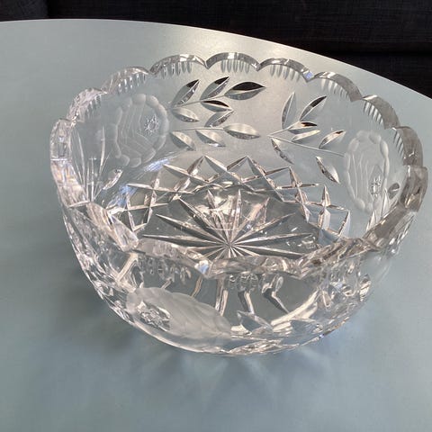 Skål i klart glas med mønstret design. Skålen har en diameter på cirka 20 cm og er velegnet til servering eller opbevaring af mad.