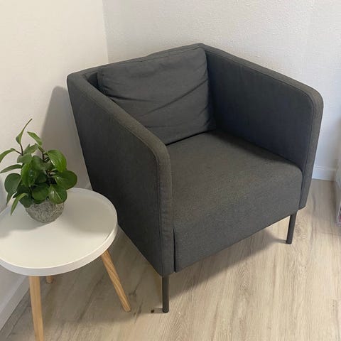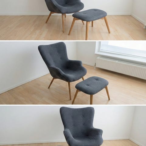 Grå stof lænestol. Sæde- og ryghynder i skum. Ben i massivt træ. God siddekomfort.