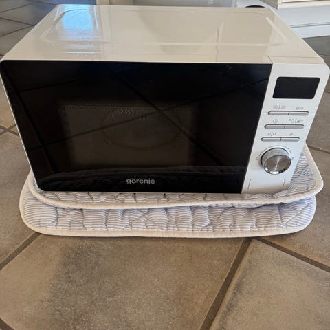 Gorenje mikrobølgeovn i hvid farve. En standard mikrobølgeovn med manuel betjening via drejeknap og knapper til forskellige funktioner.