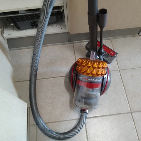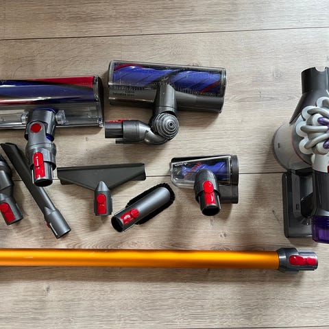 Dyson V6 støvsuger plus meget forskelligt tilbehør bestående af forskellige børster og slanger.