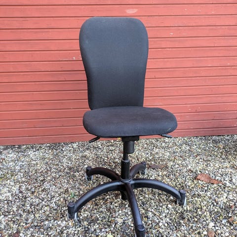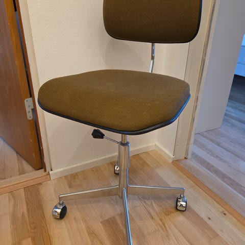 Ergonomisk arbejdsstol polstret med blåt uldstof. Sæde indstilling der let kan indstilles , mens du sidder. Trinløs indstilling af sædets hældning 10. gr. fremad og 5. gr. bagud. Trinløs indstilling af ryglæn fremad/bagud samt i højden,