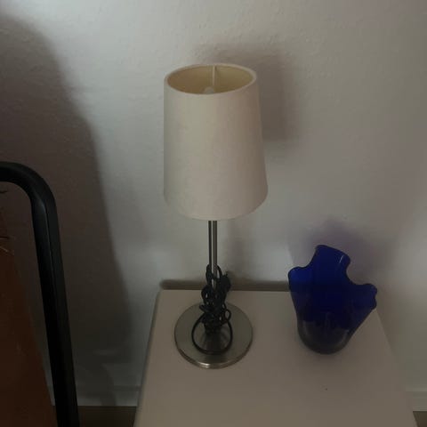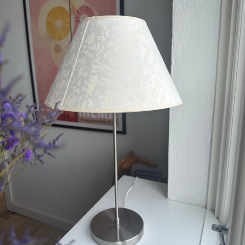Fin lille hyggelampe, sandfarvet metal skærm og blank metal fod. Lampen giver et fint lys uden den skinner i øjnene.