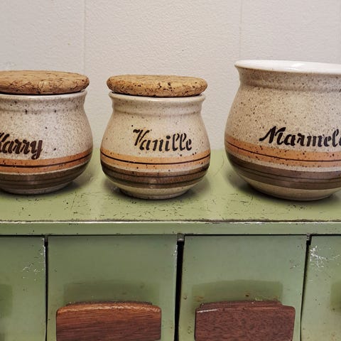 Stentøj, Krydderikrukker, 5 gamle krydderikrukker med korkprop højde 6,5 cm diameter 6 cm
