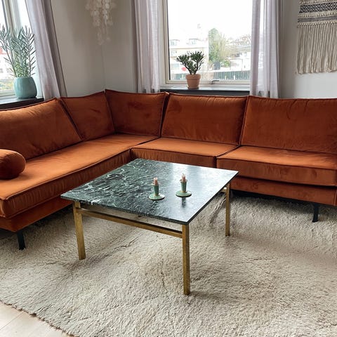Rødbrun hjørne sofa og sofabord