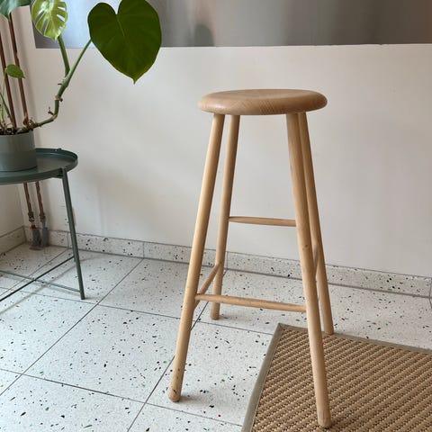 Sæt bestående af 2 barstole lavet af træ. Stolene har en rund siddeplade og fire ben med tværstivere for stabilitet. Velegnet til brug ved bar eller højt bord.