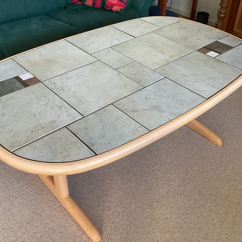 sofabord i egetræ med kakler, sandsynligvis fra 1970'erne. Det hvide man kan fornemme på bordet, er blot fra et klister mærke jeg ikke har fået rengjort✌🏼