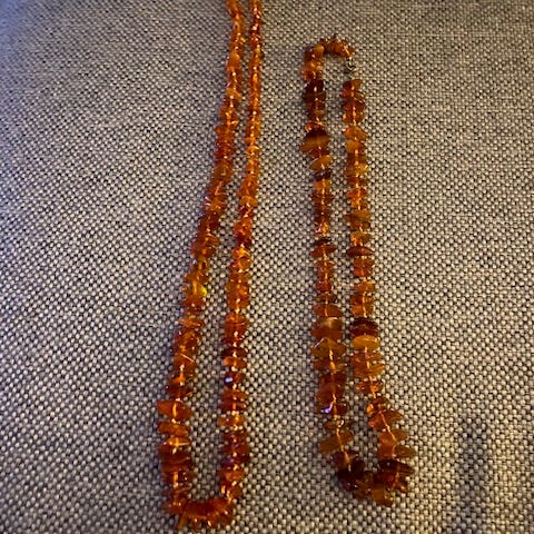 Andet smykke, rav, ukendt ældre thy rav, en ca 62 cmlang ravkæde med fine ovale ravperlerl pudsede de størte ca 1,5 cm i forløb o g i fin stand formodentlig rav fundet i thy ved thisted sendes for købers regning eller hentes her