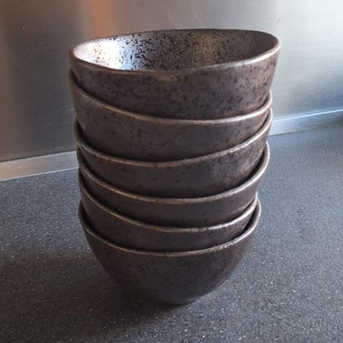 Keramik serveringssæt med tallerkener, kopper og kande i grå