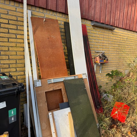 En samling af forskellige træplanker og bygningsmaterialer i varierende længder og tykkelser. Materialerne kan anvendes til konstruktion, renovering eller andre byggeprojekter.