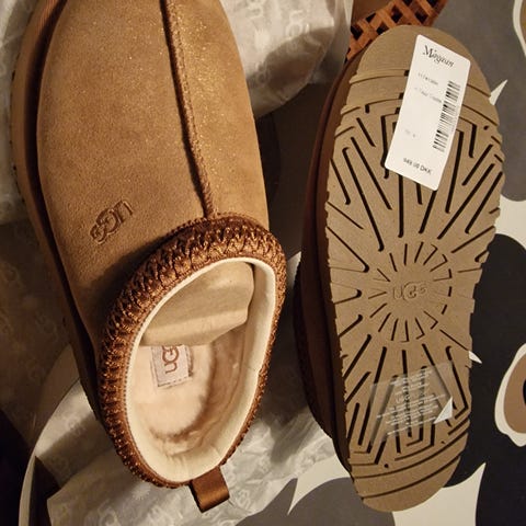 UGG hjemmesko i størrelse 38. Farven er sand. Ruskind med lamme foer.Fået i julegave men størrelse passer ikke. Skoene er købt udenlands så er ikke lige til at bytte