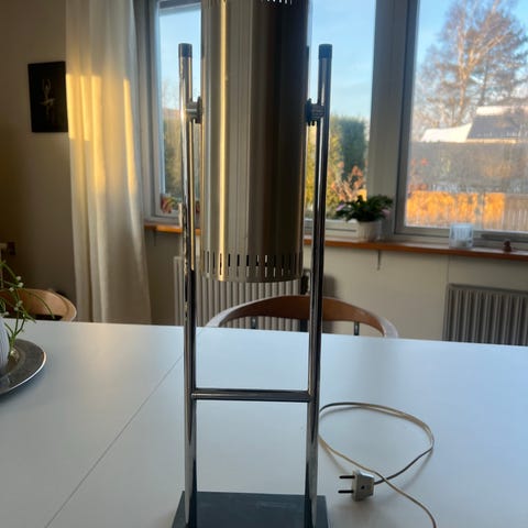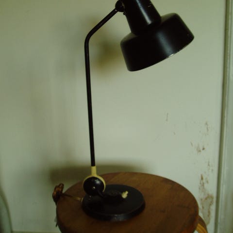 Gammel bordlampe som senere er renoveret og fremstår i flot og velfungerende stand.