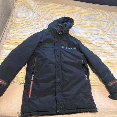 Prada Vinterjakke i størrelse L til herrer. Jakken er hvid og lavet af dun, hvilket giver isolering og varme til koldere vejrforhold. Designet til udendørs brug i vinterperioden. Den skal have en vask der er meget få spor næsten umuligt med en hvis jakke parada butikken på gågade. Kbh tar 800kr for en vask af jakken ved jeg