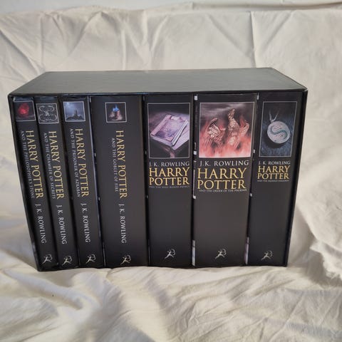 Harry Potter 1-7, J. K. Rowling, genre: fantasy, Harry Potter paperbacks af J. K. Rowling med guldskrift og sorte kanter, sjældne og udgået fra forlaget.