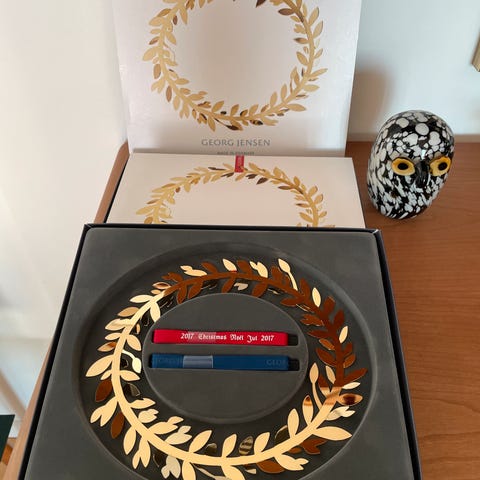 Georg Jensen Jul Dekoration Ornament i form af en guldfarvet krans. Ornamentet er designet til julebrug og har en diameter på cirka 20 cm. Materialet er metal med en blank finish. Velegnet til ophængning som julepynt. Harpun væretbrugt indendørs en enkelt gang, så rigtig fin stand
