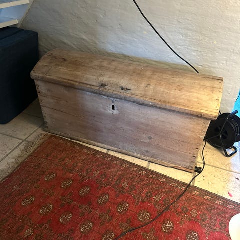 Trækiste i blå farve med låg. Kisten er rummelig og velegnet til opbevaring af forskellige genstande.