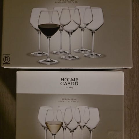 11 Rødvinsglas, 12 hvidvin, 4 hedvin, 4 Cognac.