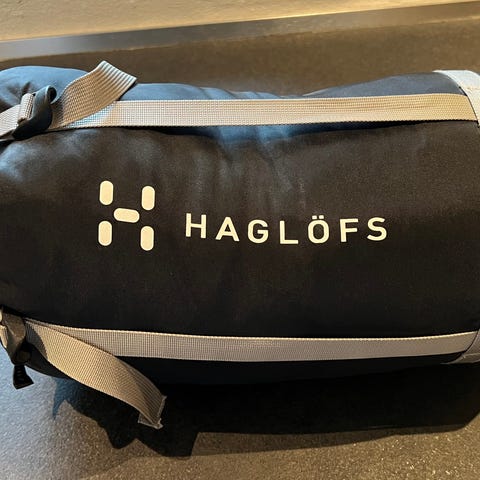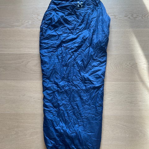 Haglöfs Ara sovepose med temperaturangivelse -+154°C, i blå farve og gul.