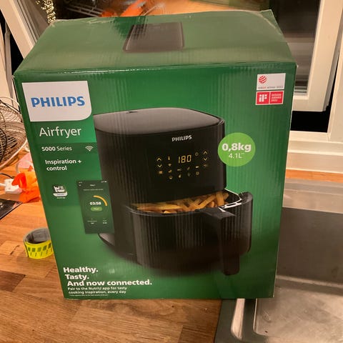 Philips Airfryer i sort farve. Elektrisk køkkenapparat til tilberedning af mad med varmluftsteknologi. Indeholder en kurv til madlavning med non-stick belægning og et aftageligt håndtag. Designet til nem rengøring og brug.