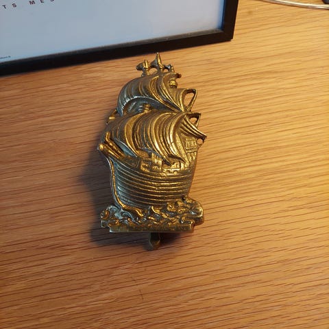 Gammel messing dørhammer med løvehoved. Kan også bruges på badeværelse med håndklæde eller i køkkenet til viskestykke.