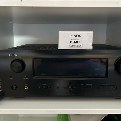 Denon AV Surround Receiver med flere indgange og udgange til tilslutning af forskellige lyd- og videokomponenter. Enheden har en frontdisplay, store drejeknapper til volumen og funktioner, samt en række terminaler til højttalerforbindelser og AV-indgange på bagsiden. Farve: sølv. Fejlfri stand. Fjernbetjening og målemikrofon medfølger. Afhentes.