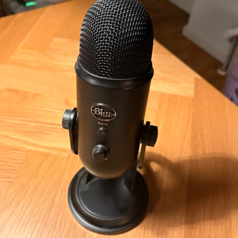 Blue Yeti mikrofon i blå farve med bordstativ. Velegnet til optagelse af lyd til streaming, podcasting og andre lydoptagelser.