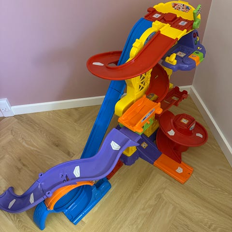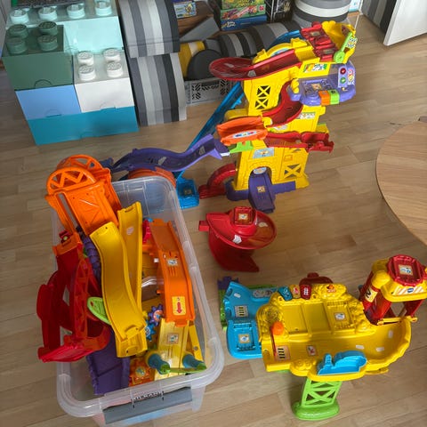 Vtech toot-toot Drivers racer bilbane. Den er komplet på nær racerbilen er gået i stykker og er der ikke, men fjernbetjeningen er der. Hvis man har sådan en og måske nogle af bilerne er den perfekt.