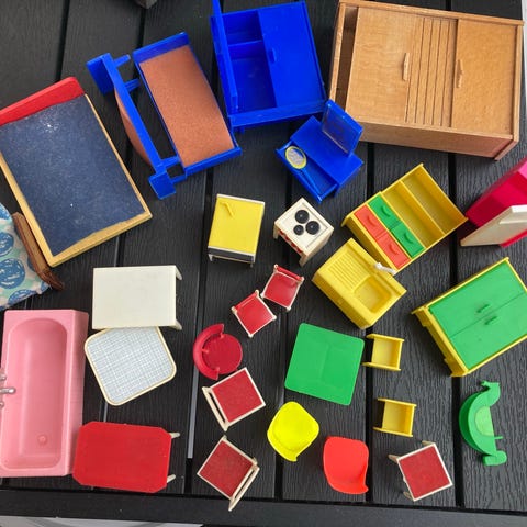 3 spisebordsstol samt spisebor og 4 lænestole i træ til dukkehus.