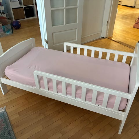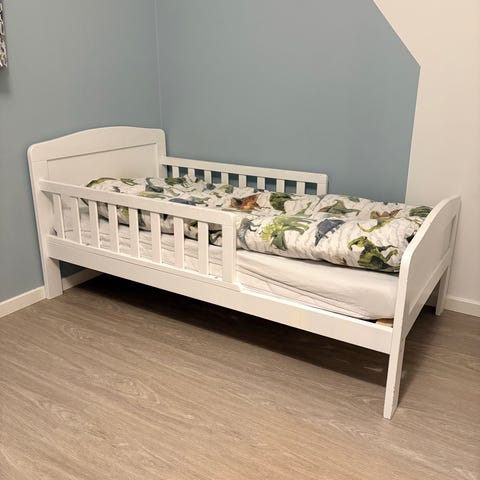 Jollyroom Juniorseng til børn. Sengen har en grå farve og inkluderer en madras + 2 lagn og 2 vådlæggerlagn Designet til brug som juniorseng.
