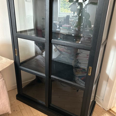 Flot og velholdt vitrineskab med glas skydelåger fra IKEA. Sort træstruktur med glas i siderne + i skydelågerne.