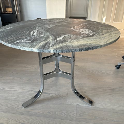 Sidebord - granitsten med ben af smedejern med alu-maling - der er huller i stenen, som passer til at gå ned og bordben, så stenen ligger fast.