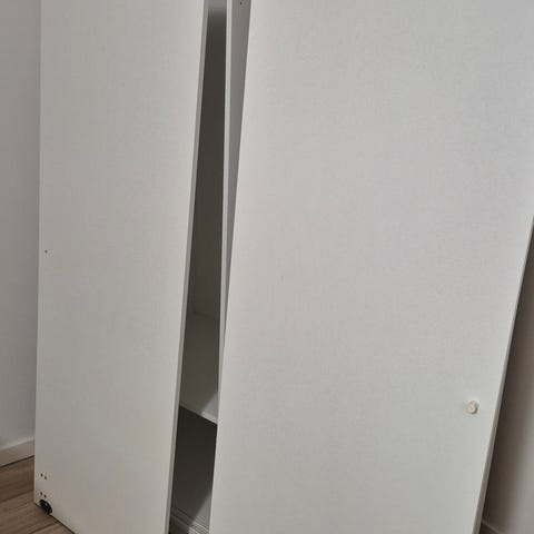 Haster: Rigtig godt og rummeligt skab til lav pris grundet flytning. Dobbeltskab med skyderdøre. Spejl på den ene skydedør. Hylder i det ene skab og bøjlestang i det andet. Enkelte brugsspor - se sidste billede. Køber skal selv afhente skabet. Vi har netop skilt det ad. Det står i stueetage, så det skal ikke bæres ned ad trapper. Hurtig afhentning prioriteres. Skal hentes idag mandag eller imorgen tirsdag.