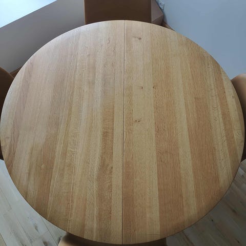 FDB Møblers C65 Åstrup spisebord i lakeret egetræ. Bordet måler 220 cm. lang i stående mål og fuld udslået kommer det op på hele 340 cm. Bordet har en farveårgang imellem bord og tillægsplader, samt en lille ridse som angivet på billedet. Andre mindre kosmetiske fejl kan forekomme.