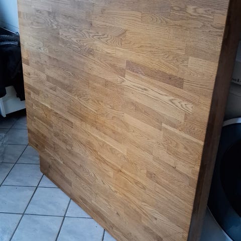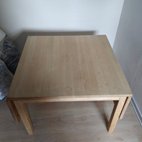 Der er tydelige brugsspor, og alle hjørner har afslag/slid (se billeder). Overfladen er generelt slidt og bordet sælges derfor som renoverings-/projektbord, hvor køber selv står for istandsættelse.