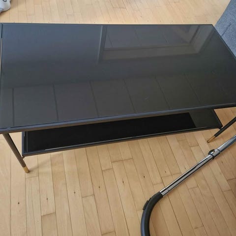 Gråt sofabord med praktisk underskuffe, som er synlig under glasplade (vi har brugt skuffen til indsamlede fossiler), og nederst en underhylde (som vi har brugt til brætspil). Særdeles anvendeligt til sommerhus, børneværelse eller sofahjørne.