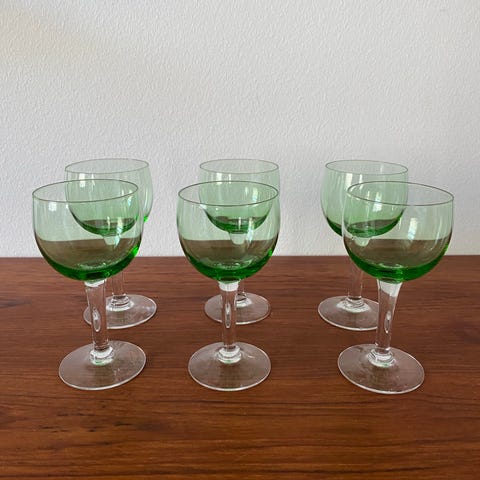 To grønne portvins glas. Begge glas har skår på foden.