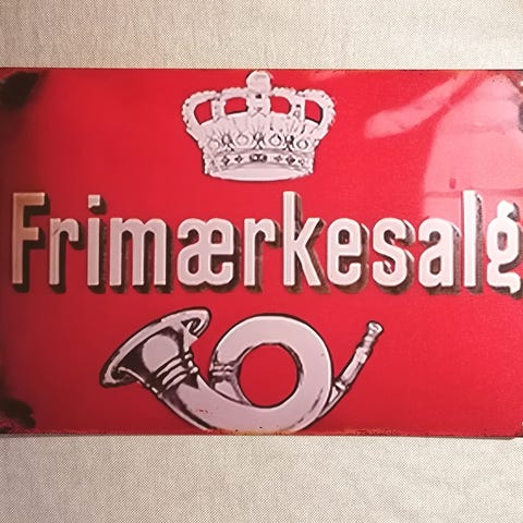 Frimærkesalg metal skilt med rød og sort farve samt hvid tekst. Skiltet har et motiv med en posthorn og en krone. Materialet er metal. Logo og bogstaver er fremhævet.