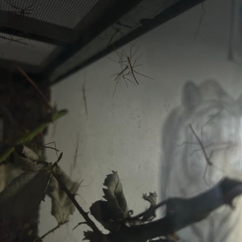 Jeg giver nogle vandrende pinde-nymfer gratis væk. Arten hedder Medauroidea Extradentata og er kendt for at være et af de absolut nemmeste dyr at holde. De bliver omkring et år gamle og er rolige, stille og fascinerende at følge i hverdagen.