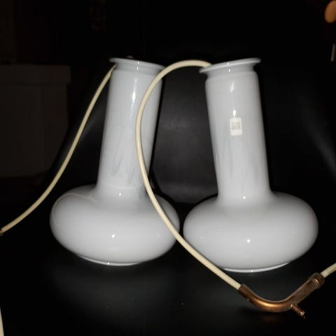 Holmegaard/Royal Copenhagen Blues pendel i hvidt opalglas med svag blå dekoration som ses tydeligt når der er lys i lampen