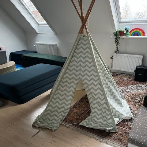 Alice & Fox Tipi telt til børn fremstillet i hvidt stof. Designet til indendørs brug som en børnelegetelt eller hyggeligt opholdssted. Teltet har en trekantet form med åbning foran og er egnet til leg og afslapning.