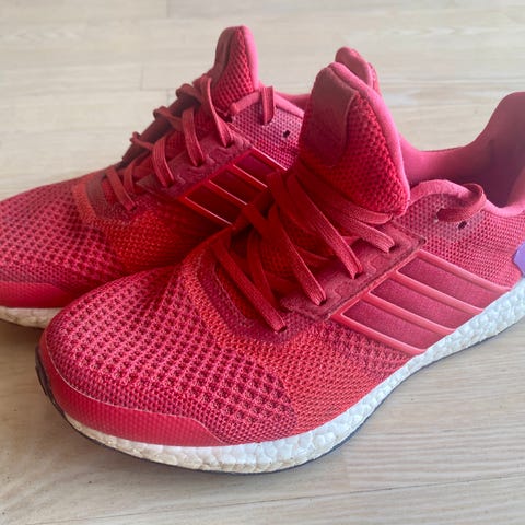 Adidas ultraboost løbesko i størrelse 37 1/3, designet til løb. Skoene er rosa og lavet af åndbart materiale. De er brugt et par gange, så selve skoen er nærmest ikke brugt. Dog kan man se det på undersålen at der er lidt brugsspor