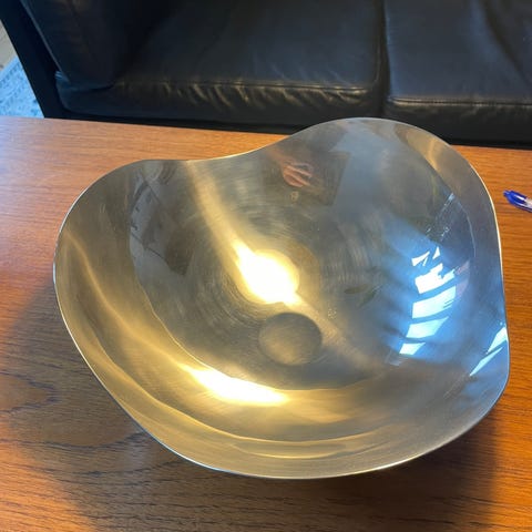 George Jensen Bloom bladformet rustfri stål skål. Skålen har en blank, metallisk overflade og et moderne design, der kan anvendes til servering eller som dekorativ genstand.